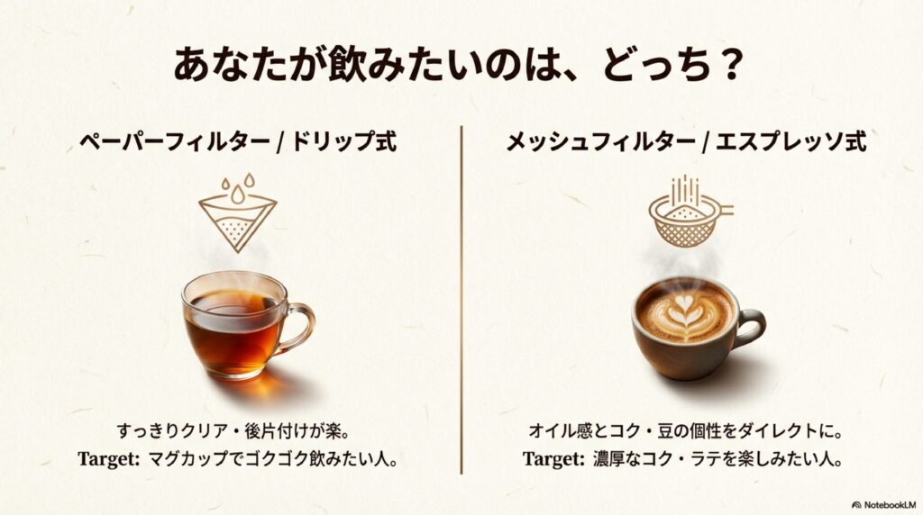 ペーパーフィルターは、コーヒーの油分(オイル)や微粉を吸着するため、雑味のないスッキリとしたクリアな味わいになります。使用後はフィルターごとポイっと捨てるだけなので、後片付けが圧倒的に楽なのも魅力です。