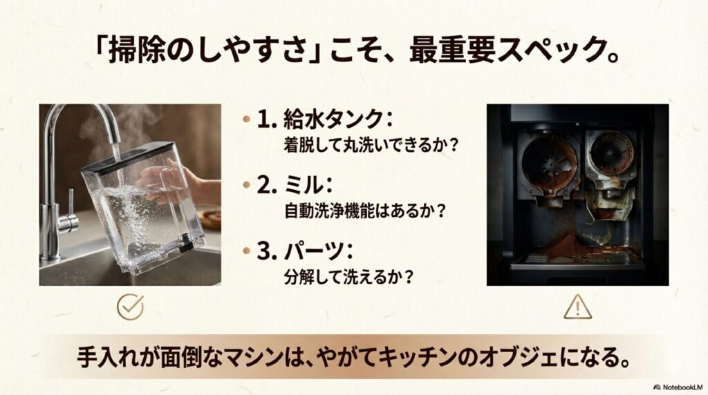 どれだけ美味しいコーヒーが淹れられても、毎日の掃除が面倒だと、次第に使わなくなりキッチンのオブジェと化してしまいます。これは多くのユーザーが陥りがちな罠です。長く使い続けるためには、「メンテナンス性」こそが最重要スペックと言っても過言ではありません。
