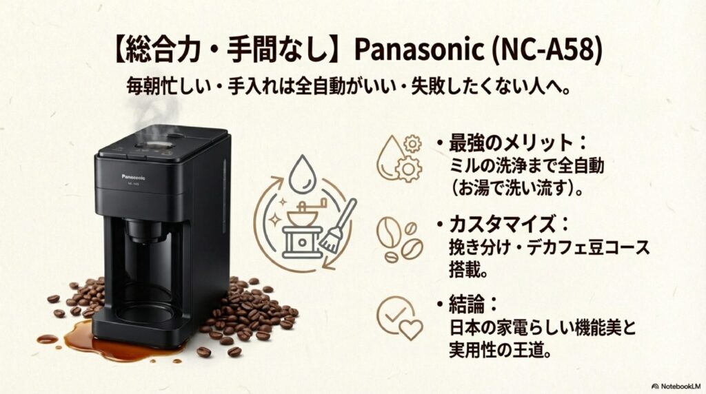 「初めての全自動で失敗したくない」「手入れの手間は極力減らしたいけれど、味も妥協したくない」という方に、自信を持っておすすめできるのが、Panasonic(パナソニック)の「NC-A58」シリーズです。長年にわたり愛され続けている、全自動ドリップ式の王道中の王道です。