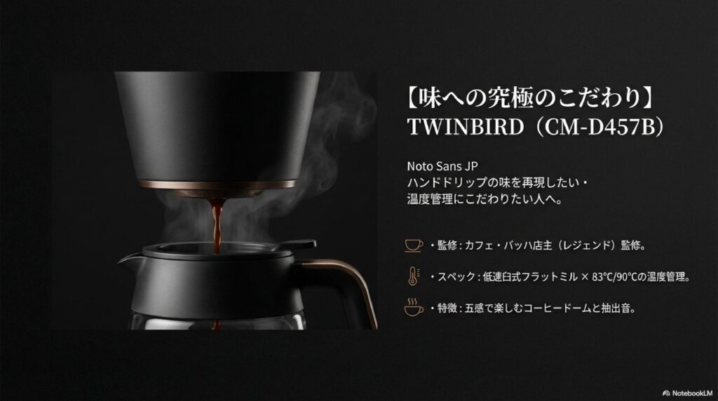 「自宅で喫茶店のような、プロが淹れたハンドドリップの味を再現したい」という強いこだわりを持つ方には、TWINBIRD(ツインバード)の「CM-D457B」をおすすめします。この製品は、コーヒー界のレジェンドと呼ばれる「カフェ・バッハ」の店主が監修したことで大きな話題となりました。